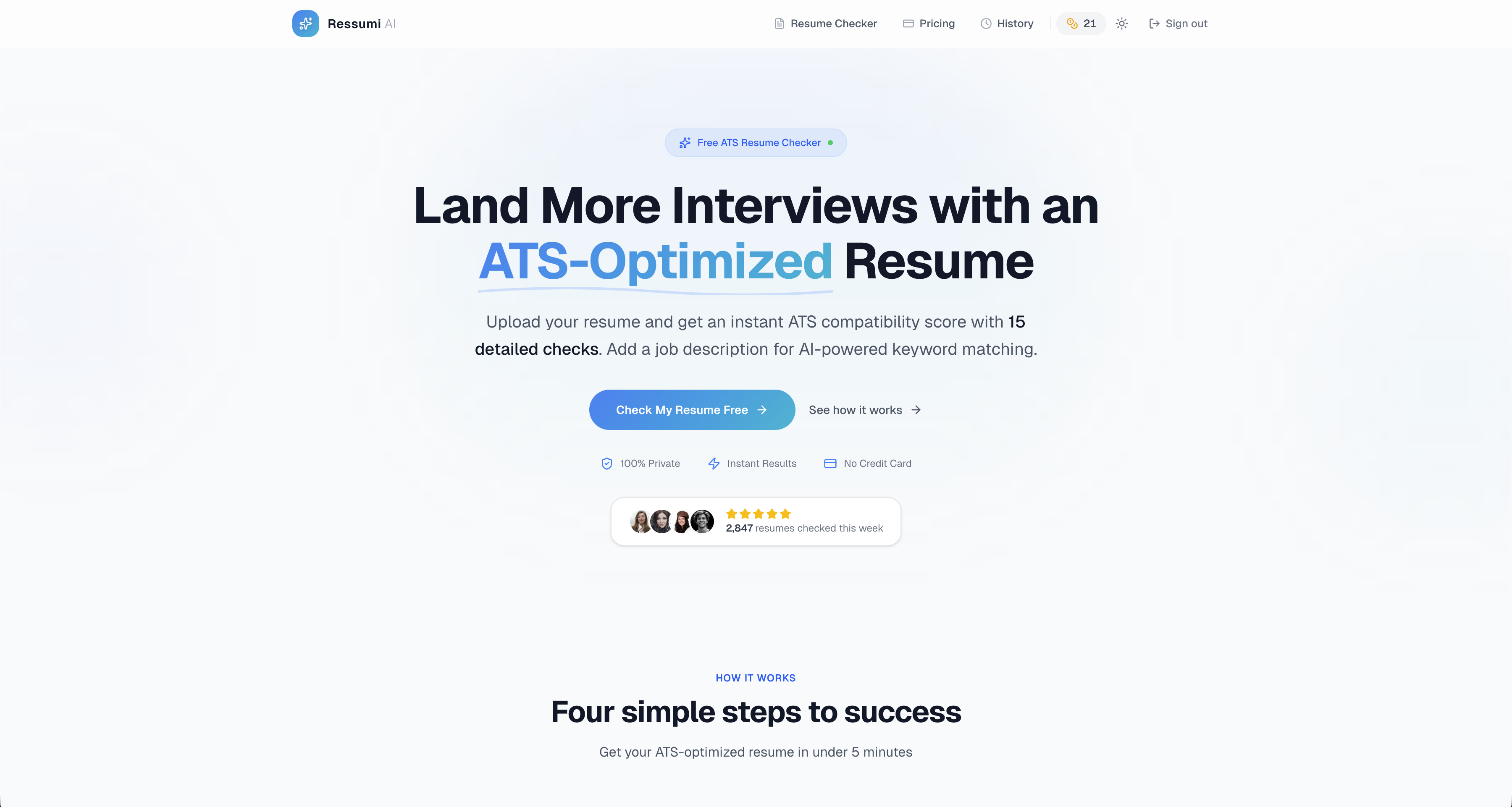 Free AI-powered resume optimizer that scores ATS compatibility, matches keywords against job descriptions, and generates optimized resumes — trusted by 2,800+ users weekly.